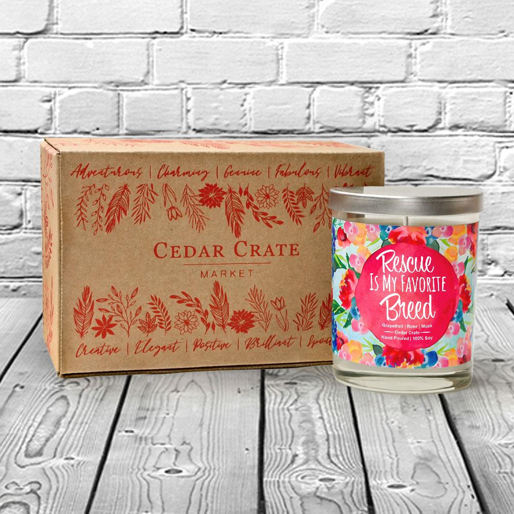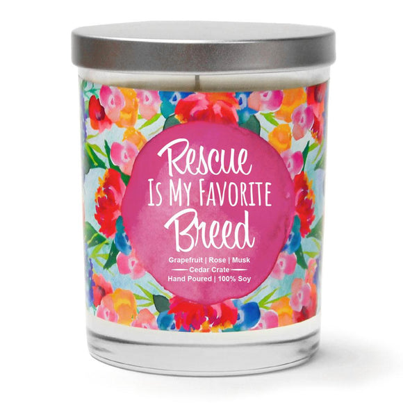 - "Rescue is My Favorite Breed" Tropical Grapefruit Candle in a 14 ounce reusable glass container with chrome lid.
